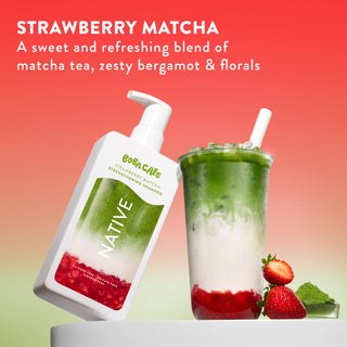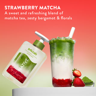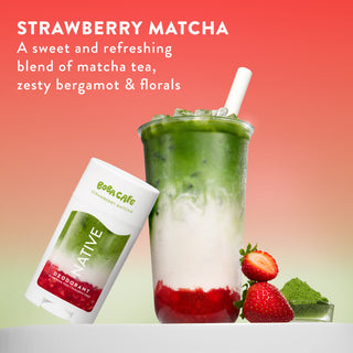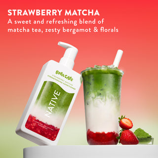 A sweet and creamy matcha tea, bright and playful strawberry, and orange flower.